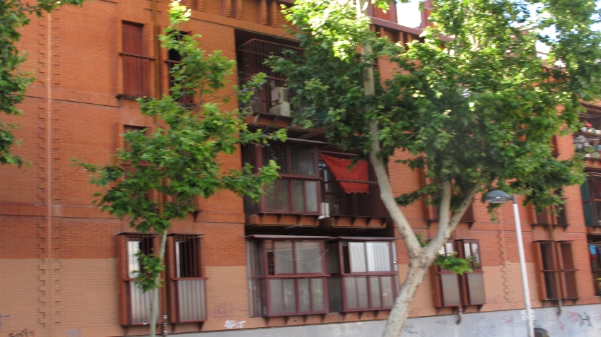 Esto son las vallas y vallas que rodean Carabanchel: viviendas de protección oficial. Isla de marginación, integrada paradójicamente en la zona más pija del barrio, al menos antes de la construcción del PAU. Desaparecidas las fábricas, se demolieron los asentamientos autoconstruidos de los obreros, quienes fueron realojados en viviendas del antiguo consorcio –actualmente IVIMA y AMV-. La dureza de sus fachadas configura la escena de esta y otras partes del barrio.