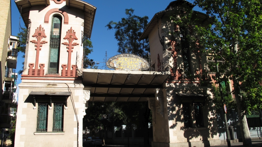 Su portada modernista sorprende con su arquitectura a quien transita por Eugenia de Montijo. Da paso,además, a una calmada isla.La Colonia de la Prensa, construida a principios del siglo XX como zona residencial para periodistas y trabajadores liberales, quedó parcialmente destruida durante la guerra civil (el frente de los carabancheles). Se conservan algunas de las hermosas casas originales, con sus balcones, decoraciones geométricas y vegetales, así como sus jardines. Éstas comparten calles con otros edificios mucho más nuevos y de apariencia muy distinta: bloques de vivendas proyectados en los años 70’ y 80’ que hacen evidente la frontera de clase, interna y externa.