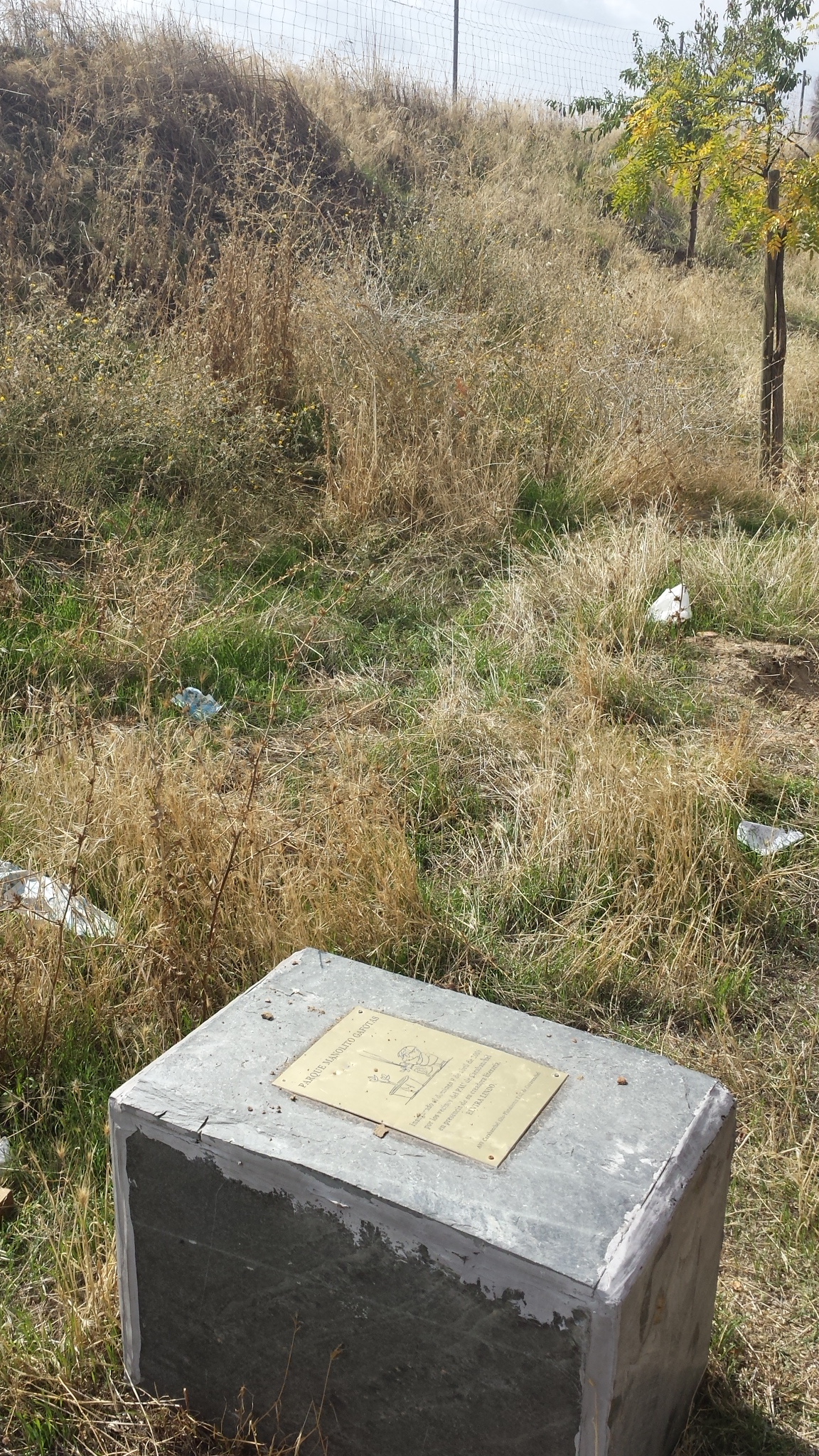 Somos guiados hasta este proto-parque por algunos vecinos. Antes hemos pasado por otros pequeños parquecitos, en uno de los cuales había una actividad de patinaje entre peques y sus familiares (organizado por gente vinculada a la Casa del Barrio). En general se aprecia el déficit en mantenimiento de jardinería en todo el PAU, pero en este parquecito, Manolito Gafotas, ni siquiera hay parque que mantener. El ayuntamiento nunca ha querido convertirlo en una verdadera zona verde cuidada, motivo por el cual las reivindicaciones vecinales se han centrado en construirlo simbólicamente como parque (nombrándolo, plantando árboles, poniendo una placa…).
