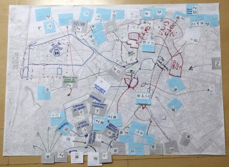 El resultado – no podría ser de otra manera – fue un mapa bastante chulo que fue pasando de vacío a lleno, luego a muy lleno y finalmente a petado, de líneas, iconos, nombres, historias y biografías. De formal, normal, institucional fue pasando a subjetivo, colectivo y crítico. De las líneas rectas, avenidas y edificios a las curvas, los garabatos, las reivindicaciones y los recuerdos.